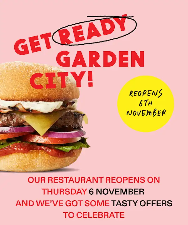 Available at Grill’d Garden City from 10:00am on Thursday 6th November 2025 until sold out. Offer available for dine in and takeaway orders only. Limited to the first 754 customers. Limit one per customer. Only applicable for Simply Grill’d, Crispy Bacon & Cheese, Simon Says, Healthy Fried Chicken BLAT, Garden Goodness or Kids Cheeseburger on a panini bun. Additional toppings and specialty buns at an additional cost. Not available via Grill'd online ordering, At Table ordering or Third-Party delivery partners. Offer is not valid in conjunction with any other offer or discount unless otherwise stated. Offer is not redeemable for cash, cannot be redeemed against a prior purchase and cannot be transferred. Offer is subject to change at any time.
